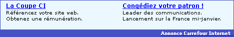 Il vous est possible de diffuser une annonce texte sur notre réseau francophone. Vous devez simplement indiquer un titre, une description de votre produit et son adresse web. Vous avez la possibilité de cibler vos annonces par mots-clés. Nous diffusons plus de 2 millions d'annonces texte par jour. Votre annonce apparaît dans plusieurs formats de bannières et dans des annonces flottantes. Vous payez uniquement pour des personnes intéressées par votre produit.